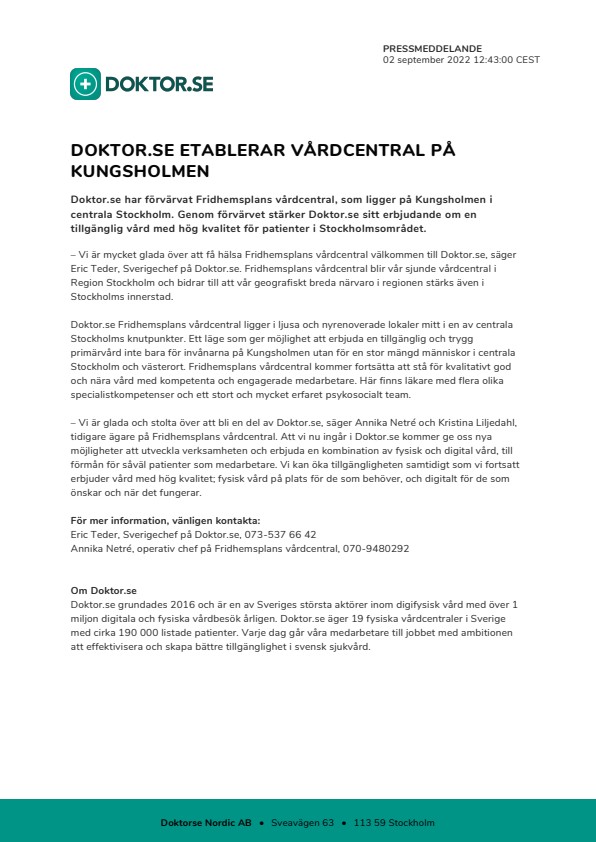 – Vi är mycket glada över att få hälsa Fridhemsplans vårdcentral välkommen till Doktor.se, säger Eric Teder, Sverigechef på Doktor.se. Fridhemsplans vårdcentral blir vår sjunde vårdcentral i Region Stockholm och bidrar till att vår geografiskt breda närvaro i regionen stärks även i Stockholms innerstad.